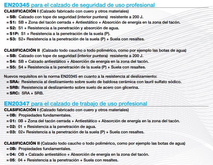 A continuación puedes encontrar la clasificación de los zapatos según las normativas:
